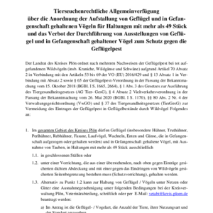 Tierseuchenrechtliche Allgemeinverfügung über die Anordnung der Aufstallung von Geflügel und in Gefangenschaft gehaltenen Vögeln für Haltungen mit mehr als 49 Stück und das Verbot der Durchführung von Ausstellungen von Geflügel und in Gefangenschaft gehaltener Vögel zum Schutz gegen die Geflügelpest