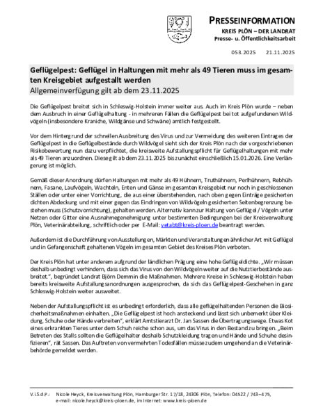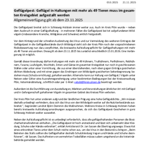 Öffentliche Bekanntmachung des Kreises Plön & Pressemitteilung Geflügelpest